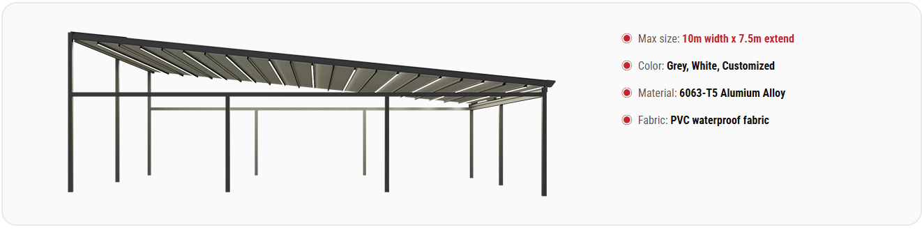 Discover the Retractable Roof - a smart, openable system that freely transforms space and light. It perfectly blends modern aesthetics with practical functionality, creating a versatile indoor-outdoor experience for you. Applicable venue: ◉High-end clubs, star hotels, villas, squares and other outdoor places. ◉Terraces, restaurants, swimming pools, gardens, private residential areas, etc.