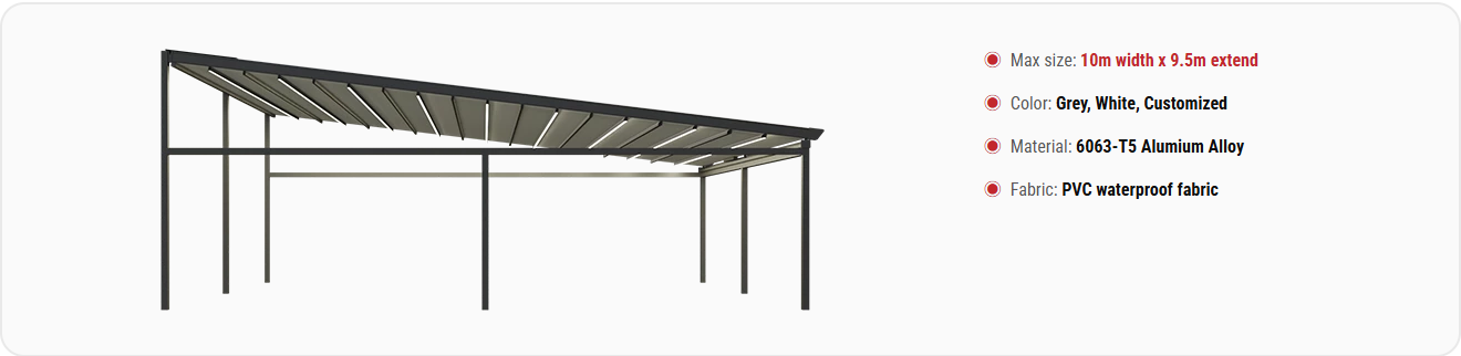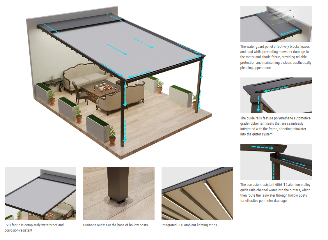 The retractable roof, a popular sunshade product in Europe, has been launched after meticulous design and repeated improvements, winning the favor of a wide range of users. The product is both practical and aesthetically pleasing, delivering excellent performance in sun protection, rain resistance, windproofing and UV resistance!